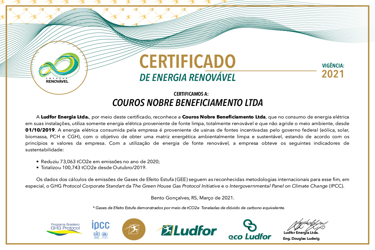 A Ludfor Energia Ltda. certifica e reconhece a Couros Nobre Beneficiamento Ltda., que no consumo de energia elétrica em suas instalações, utiliza somente energia elétrica proveniente de fonte limpa, totalmente renovável e que não agride o meio ambiente, desde 01/10/2019. A energia elétrica consumida pela empresa é proveniente de usinas de fontes incentivadas pelo governo federal (eólica, solar, biomassa, PCH e CGH), com o objetivo de obter uma matriz energética ambientalmente limpa e sustentável, estando de acordo com os princípios e valores da empresa.